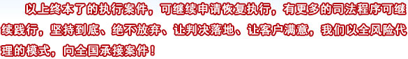 我们尽心尽力以全风险代理”执行案件,专业专注于执行难,以执行结果拿报酬,以实力说话,以结果为凭。设有执行终本案件实践研究中心,专注研究终本案件后续适用救济的法律法规和程序及实践经验的研究,深入执行难,让执行不在难,坚持到底,永不放弃,让判决落地,让客户满意。